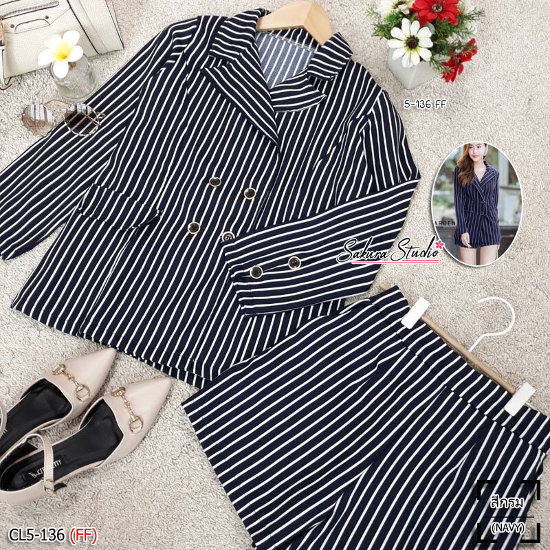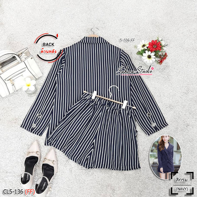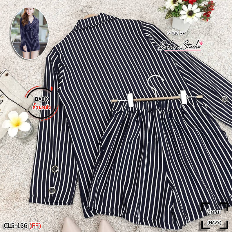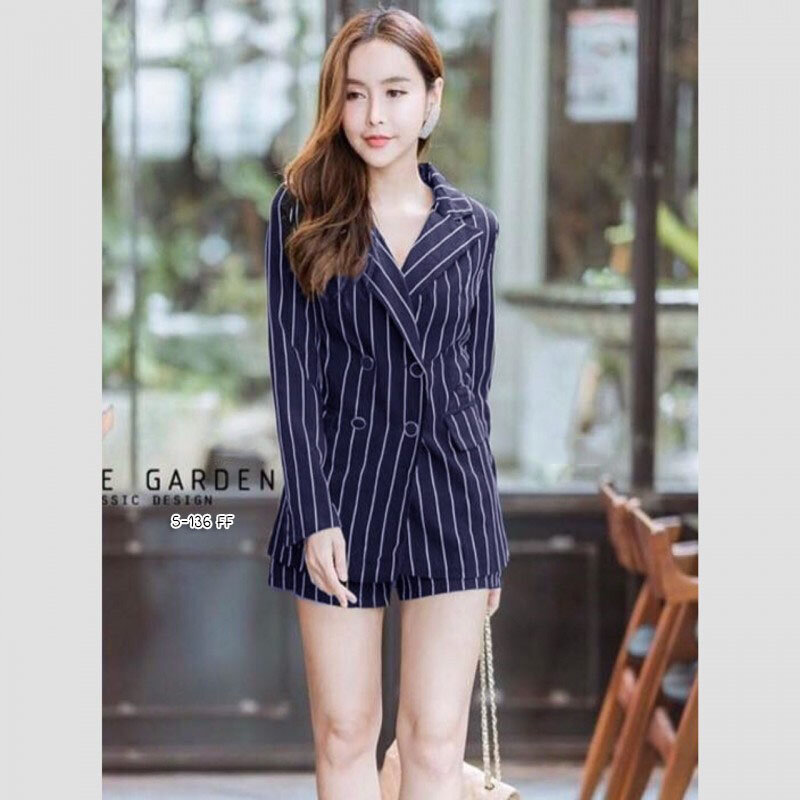 เซ็ต 2 ชิ้น บลาเซอร์แขนยาวติดกระดุมหน้า งานผ้าโฟร์เวย์ลายริ้ว ใส่คู่กับกางเกงขาสั้นผ้าเดียวกัน งานเอวยือดสม็อคด้านหลังเจาะกระเป๋าล้วงสองข้าง ได้ลุคเก๋ๆ ใส่สวยชิลได้บ่อยๆ ห้ามพลาด